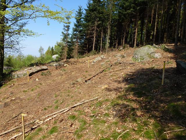 Am Montag, 11.04.2011 wurden Fakten geschaffen: Die Bäume, die von uns am vergangenen Sonntag markiert wurden, sind nun abgeholzt, der Grundriss für die neue Hütte abgesteckt, jetzt können die Baggerarbeiten beginnen.