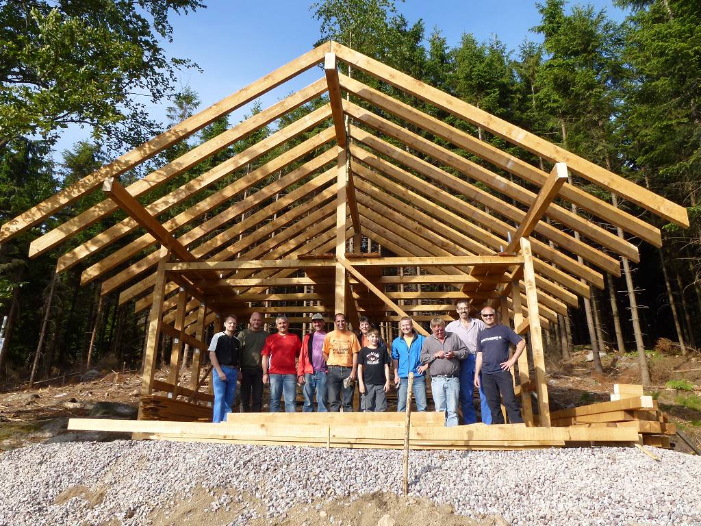 Nach einer unglaublichen Zeit von nur 9 Stunden konnte bereits der Richtbaum gesetzt werden und der komplette Rohbau der Hütte stand.